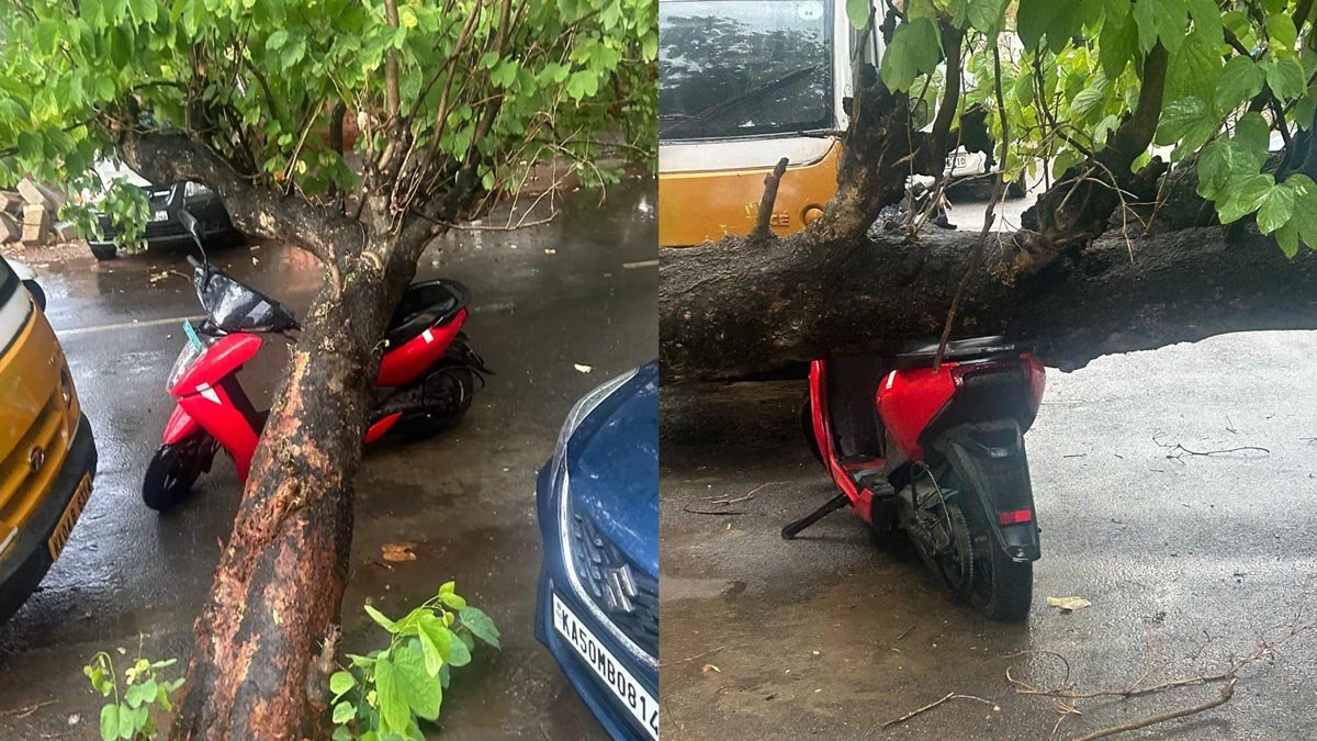 Tree Fell On Ather 450 Electric Scooter In Bengaluru | பெங்களூரில் பெய்த கனமழையில் மரம் ஒன்று சாலையின் ஓரத்தில் நிறுத்தி வைக்கப்பட்டிருந்த ஏத்தர் 450 எலக்ட்ரிக் ஸ்கூட்டரின் மீது விழுந்துள்ளது. இதில் ஆச்சிரியமான விஷயம் என்னவென்றால், ஸ்கூட்டரில் எந்தவொரு சேதாரமும் ஏற்படவில்லை.