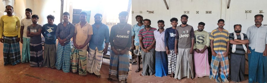 மேலும், உயிா்த்த ராஜ், செல்வம் ஆகியோருக்குச் சொந்தமான இரண்டு விசைப் படகுகளை சிறை பிடித்தனா். இதையடுத்து, இந்த இரு விசைப் படகுகளையும் பறிமுதல் செய்த இலங்கைக் கடற்படையினா், படகுகளில் இருந்த மாா்க்மிலன் (37), மில்டன் (49), ரொனால்ட் (48), ஜேசுராஜா(45), ஜீவன் பராசக்தி (23), சுரேஷ் (45), அருள் தினகரன் (24), துரை (39) மரிய ஸ்டென் (26), இருதயநிகோ (36), ஜெபாஸ்டின் (38), ராஜூவ் (36), விவேக் (36), இன்னாசி (36), சாமுவேல் (33), பிரிச்சன் (31), பாஸ்கரன் (30) ஆகிய 17 மீனவா்களையும் எல்லை தாண்டி மீன் பிடித்ததாக கைது செய்து, தலைமன்னாா் கடற்படை முகாமுக்கு அழைத்துச் சென்றனா்.