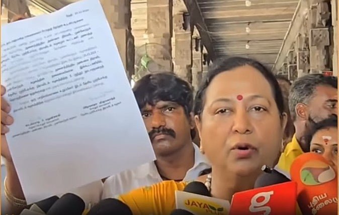 அதிமுக பொதுச்செயலாளர் எடப்பாடி பழனிசாமி 2024-ல் கையெழுத்திட்டு வழங்கிய தொகுதி பங்கீடு ஒப்பந்தத்தை செய்தியாளர்கள் முன்பு காண்பித்திருக்கிறார் தேமுதிக பொதுச்செயலாளர் பிரேமலதா விஜயகாந்த்.