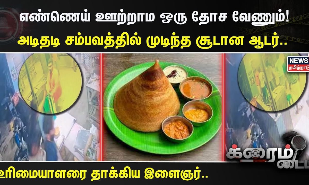 Crime Time | மயிலாடுதுறை மாவட்டம் குத்தாலம் அருகே தோசையில் எண்ணெய் ஊற்றி சுட்டு கொடுத்ததால், ஹோட்டல் ஊழியரை தாக்கி கடையை சூறையாடி இளைஞர்கள் மீது போலீசார் வழக்குப்பதிந்துள்ளனர். அடிதடி, கலைப்பு என ஆக்ரோஷ செயலில் ஈடுபட்ட இளைஞர்கள் யார்? நடந்தது என்ன?செய்திகளை துல்லியமாகவும் துரிதமாகவும் வழங்கும் தமிழகத்தின் முதன்மை செய்தி தொலைக்காட்சி உங்கள் நியூஸ்18 தமிழ்நாடு.