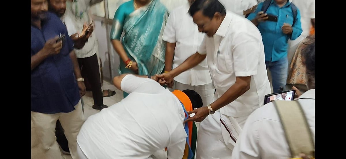 பதிலுக்கு கோவிந்தராஜனும் வணக்கம் செலுத்தியபோது திடீரென சுதாகர், தி.மு.க வேட்பாளர் கோவிந்தராஜனின் காலில் விழுந்து `அண்ணே என்னை ஆசீர்வாதம் பண்ணுங்க’ எனக் கூறினார். அதனால் பதறிப் போன கோவிந்தராஜன், அவசர அவசரமாக சுதாகரரை தூக்கி விட்டுவிட்டு அங்கிருந்து சென்றார்.