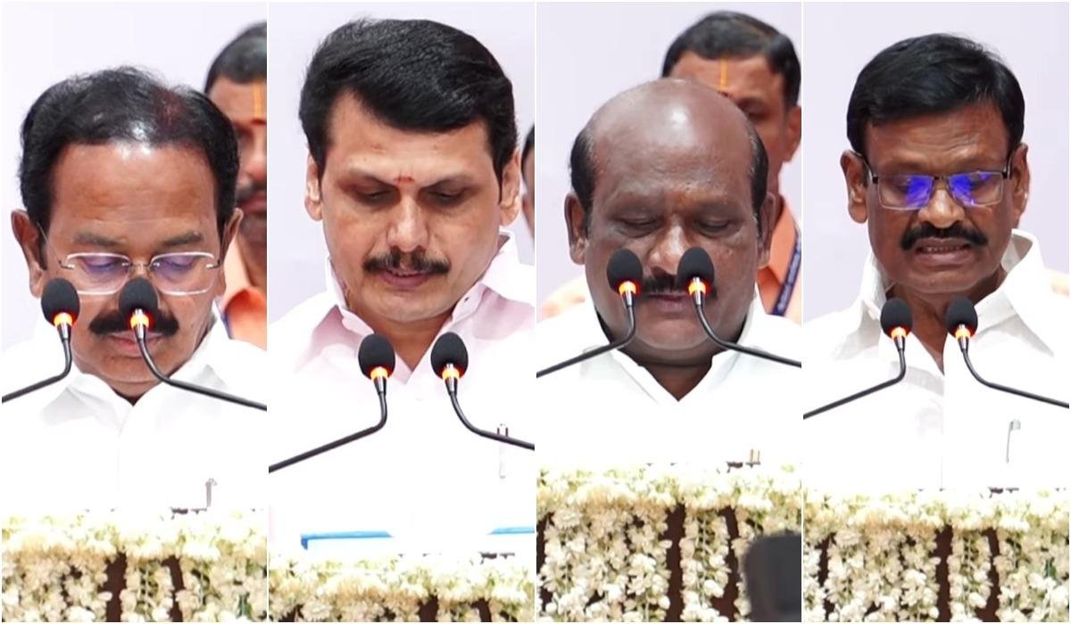 சென்னை: தமிழகத்தின் புதிய அமைச்சர்களாக செந்தில் பாலாஜி, ஆவடி நாசர், பனமரத்துப்பட்டி ராஜேந்திரன் மற்றும் கோ.வி.செழியன் ஆகியோர் பதவியேற்றனர். தமிழக ஆளுநர் ஆர்.என்.ரவி, அவர்களுக்கு பதவிப் பிரமாணம் செய்து வைத்தார்.