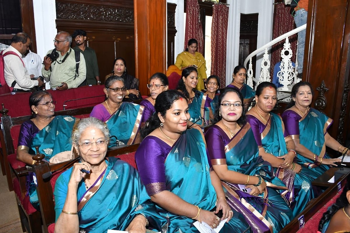 சென்னை மாநகராட்சியின் பட்ஜெட் கூட்டம் இன்று ரிப்பன் மாளிகையில் நடந்து வருகிறது. இந்தக் கூட்டத்தில் திமுக, காங்கிரஸ், பாஜக, விசிக-வை சேர்ந்த பெண் கவுன்சிலர்கள் கட்சி வேற்றுமைகளை கடந்து ஒரே ஸ்டைலில் க்ரூப் சேலை கட்டி வந்து கவனம் ஈர்த்திருந்தனர்.