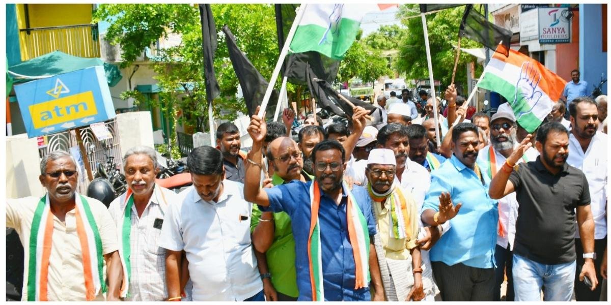 பிரதமர் நரேந்திர மோடி கன்னியாகுமரி வருகை தருவதற்கு எதிர்ப்பு தெரிவித்து திண்டுக்கல் மாநகர காங்கிரஸ் சார்பில் போராட்டம் அறிவிக்கப்பட்டது. இதையடுத்து திண்டுக்கல் மாநகர காங்கிரஸ் கட்சி தலைவர் மணிகண்டன் தலைமையில் மாநகராட்சி மண்டல தலைவர் கார்த்திக் உள்ளிட்டோர் திண்டுக்கல் பேருந்து நிலையம் அருகேயுள்ள கட்சி அலுவலகத்தில் இருந்து கருப்புக் கொடியுடன் புறப்பட்டனர்.