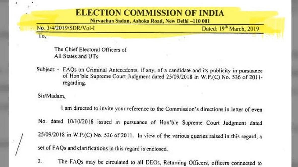 2019-ஆம் ஆண்டு வெளியிடப்பட்ட வேட்பாளர்களின் குற்றப் பின்னணி தொடர்பான வழிகாட்டுதல்கள் குறித்து விளக்கம் கோரி, பாஜக கேரளா அலுவலக தேர்தல் ஆணையத்திடம் கோரிக்கை விடுத்திருந்தது.