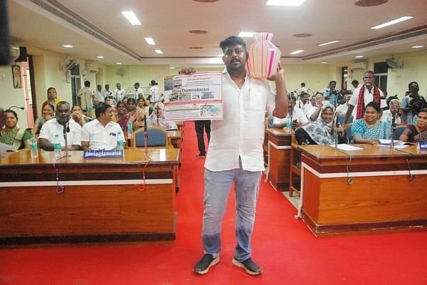 இந்த நிலையில், நெல்லை மாநகராட்சி மாமன்றக் கூட்டம் மேயர் கிட்டு என்ற ராமகிருஷ்ணன் தலைமையில் நடைபெற்றது. மாநகராட்சி ஆணையர் சுகபுத்திரா முன்னிலை வகித்தார். துணை மேயர் கே.ஆர்.ராஜூ மற்றும் மாமன்ற உறுப்பினர்கள் கலந்து கொண்ட கூட்டம் நடைபெற்றபோது, 6-வது வார்டு கவுன்சிலரான பவுல்ராஜ் தோளில் குடத்துடன் கையில் பதாகை ஏந்தியபடி அரங்கிற்குள் வந்ததால் சலசலப்பு ஏற்பட்டது.