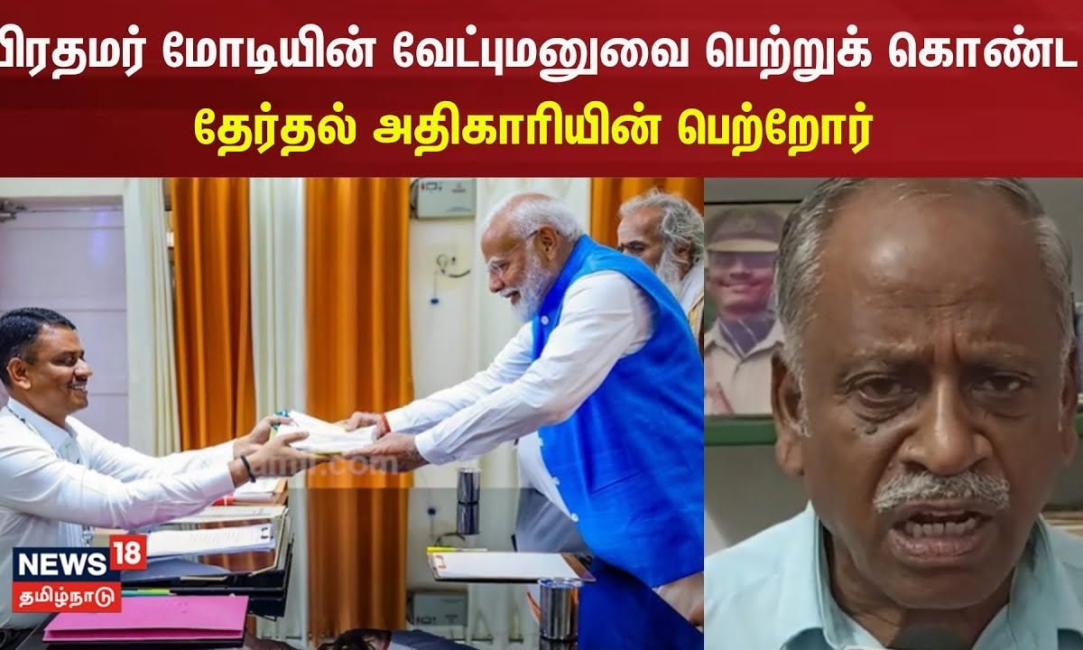 பிரதமர் மோடியின் வேட்புமனுவை பெற்றுக்கொண்ட தேர்தல் அதிகாரியின் பெற்றோர் | PM Modi | Varanasi செய்திகளை துல்லியமாகவும் துரிதமாகவும் வழங்கும் தமிழகத்தின் முதன்மை செய்தி தொலைக்காட்சி உங்கள் நியூஸ்18 தமிழ்நாடு.