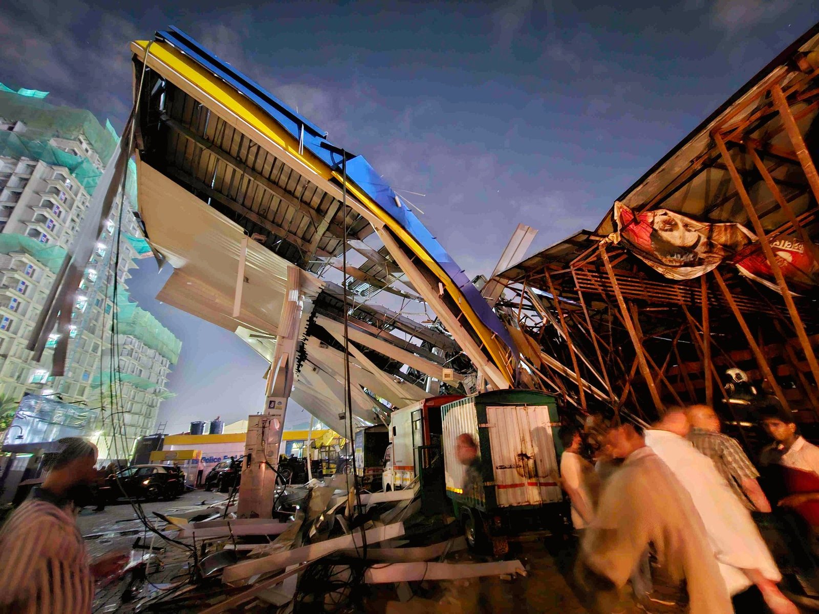 திங்கள்கிழமை வீசிய பலத்த காற்றால் 100 அடி உயரமுள்ள விளம்பர பலகை பெட்ரோல் நிலையத்தின் மீது விழுந்தது. பெட்ரோல் நிலையத்தில் சுமார் 150 வாகனங்கள் மழைக்காக ஒதுங்கியிருந்தன. 250 டன் எடை கொண்ட பலகை பெட்ரோல் நிலையத்தின் மீது விழுந்தது.