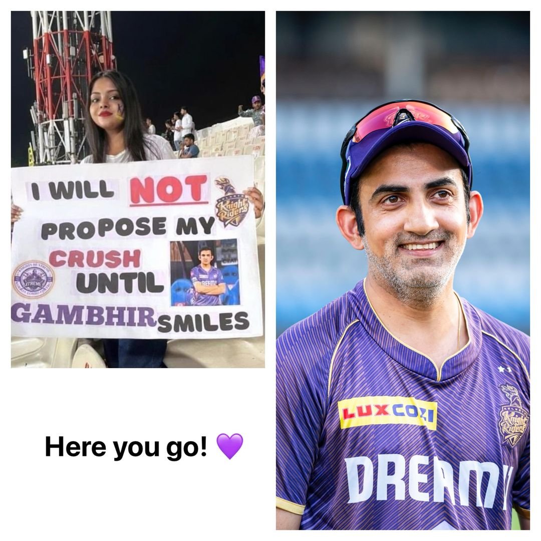 கௌதம் கம்பீர் எப்போதும் கடுகடுவென முகத்தை வைத்திருப்பார். இதனால் ரசிகை ஒருவர் கௌதம் கம்பீர் சிரிக்கும் வரை எனது காதலினடம் நான் எனது விருப்பத்தை தெரிவிக்கமாட்டேன் என பதாகை வைத்திருந்தார்.