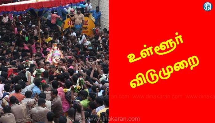 வேலூர்: குடியாத்தம் கங்கை அம்மன் கோயில் சிரசு திருவிழாவை முன்னிட்டு வேலூர் மாவட்டத்துக்கு இன்று உள்ளூர் விடுமுறை அறிவித்து மாவட்ட ஆட்சியர் உத்தரவிட்டுள்ளார். விடுமுறையை ஈடு செய்யும் வகையில் ஜூன் 22-ல் அரசு அலுவலர்களுக்கும், ஜூன் 23-ல் அச்சக பணியாளர்களுக்கும் வேலை நாளாக அறிவிக்கப்பட்டுள்ளது.